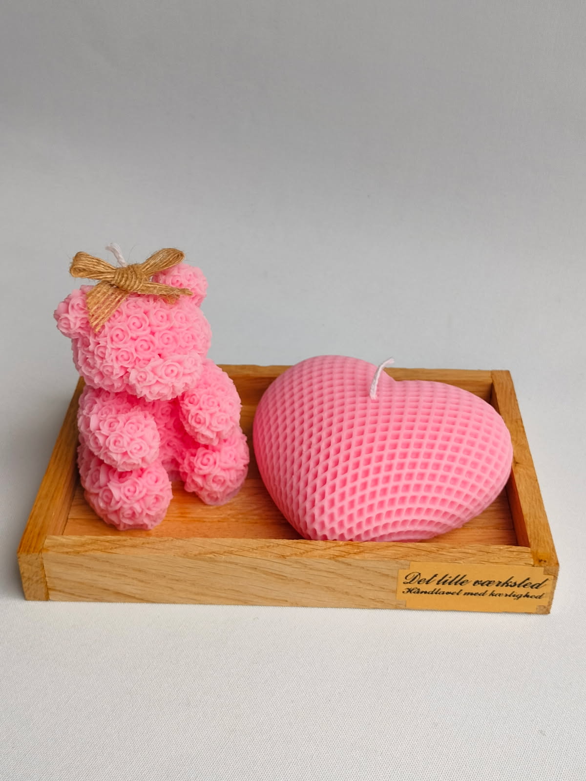 Håndlavede bamse og hjerte sojalys på et håndlavet træbakke.