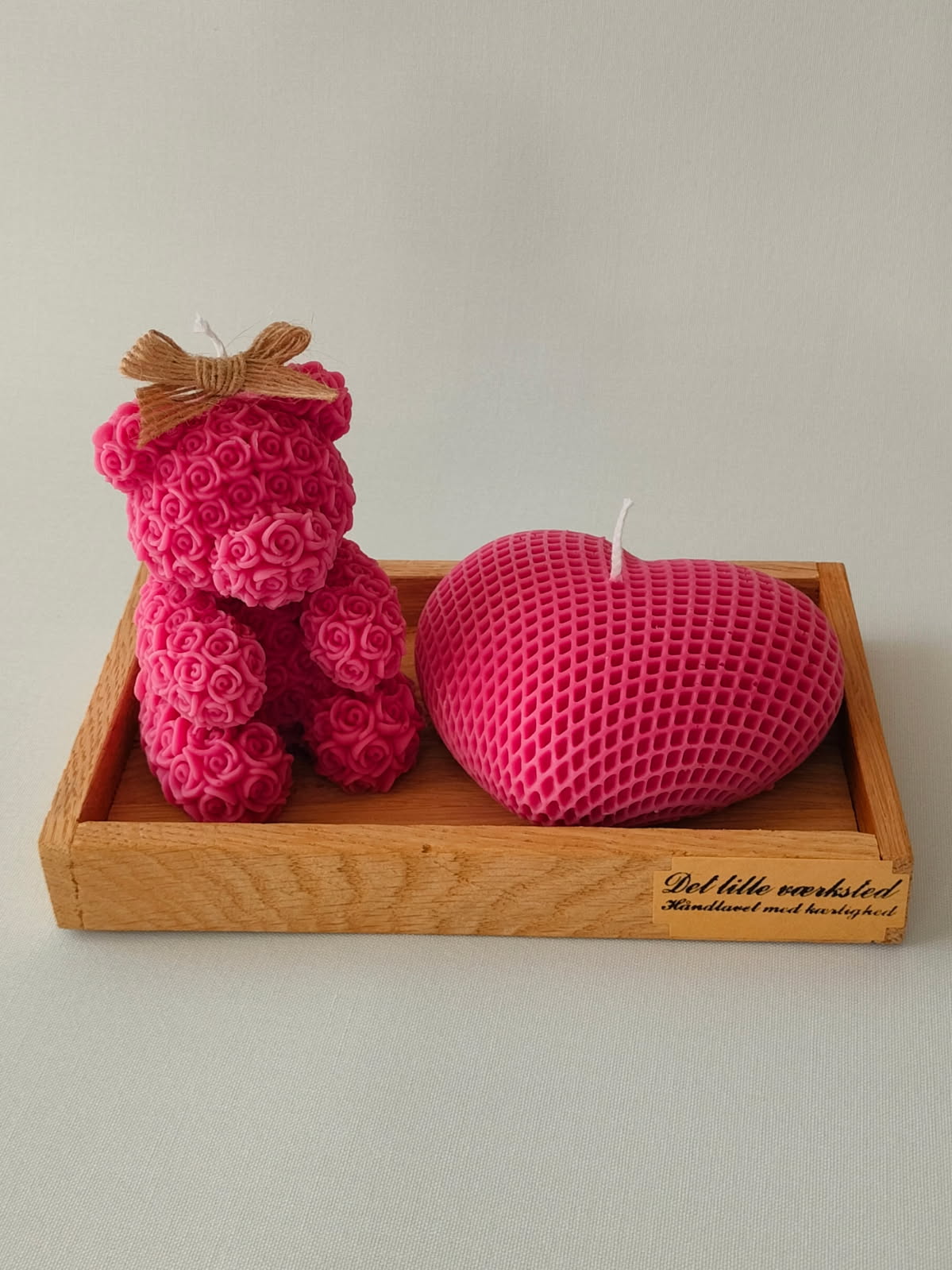 Håndlavede bamse og hjerte sojalys på et håndlavet træbakke.