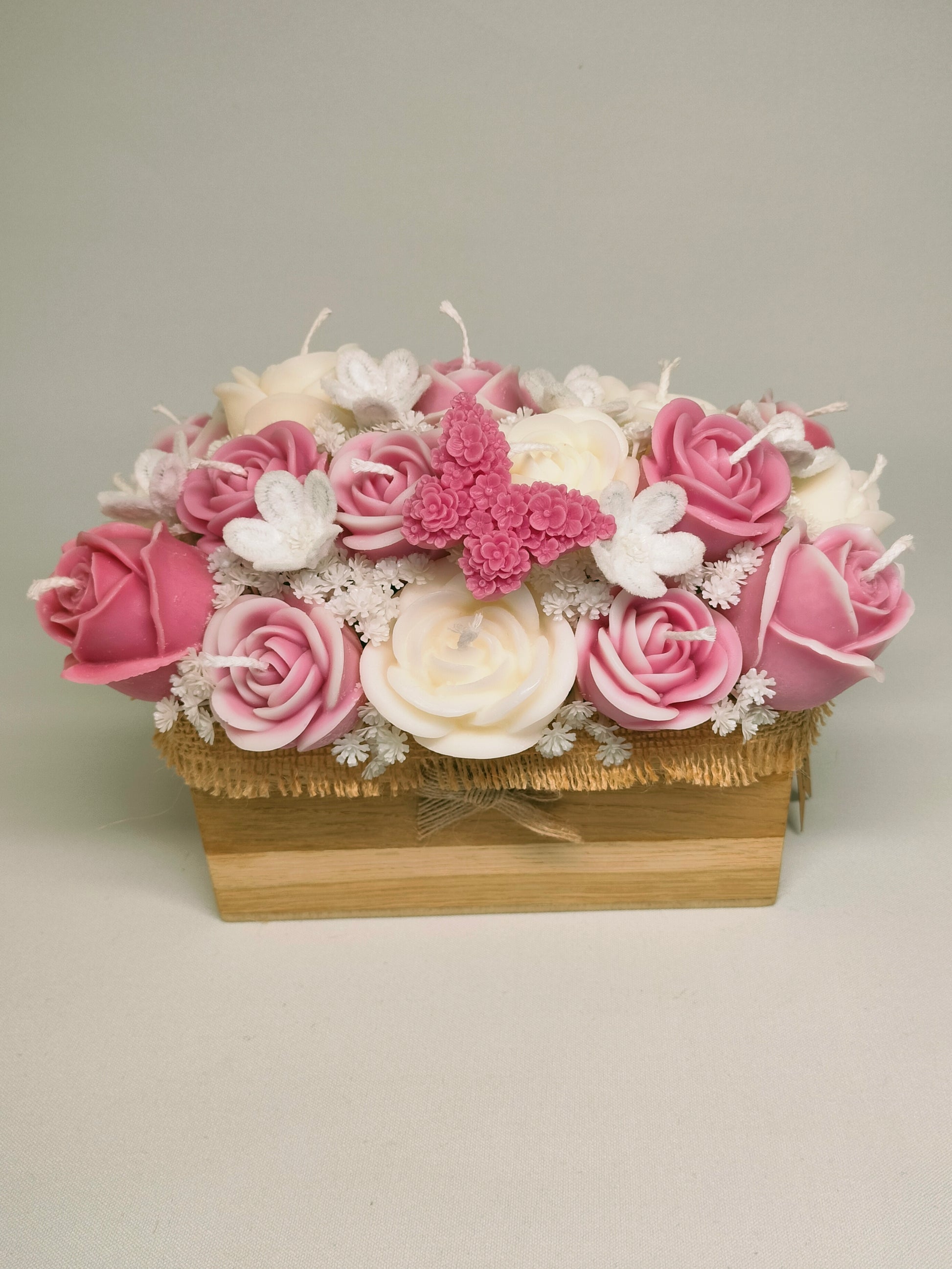 Firkantet kurv i naturlig farve omhyggeligt arrangeret med håndlavede sojalys blomster af 100% soja.