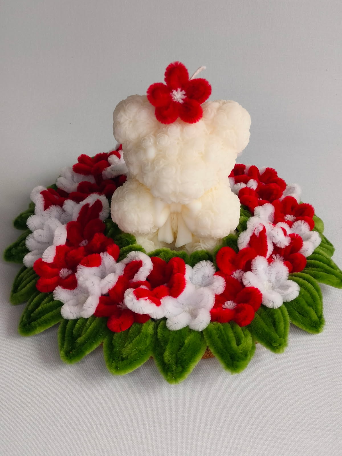 Håndlavet stor bamse lys arrangeret med julepynt.