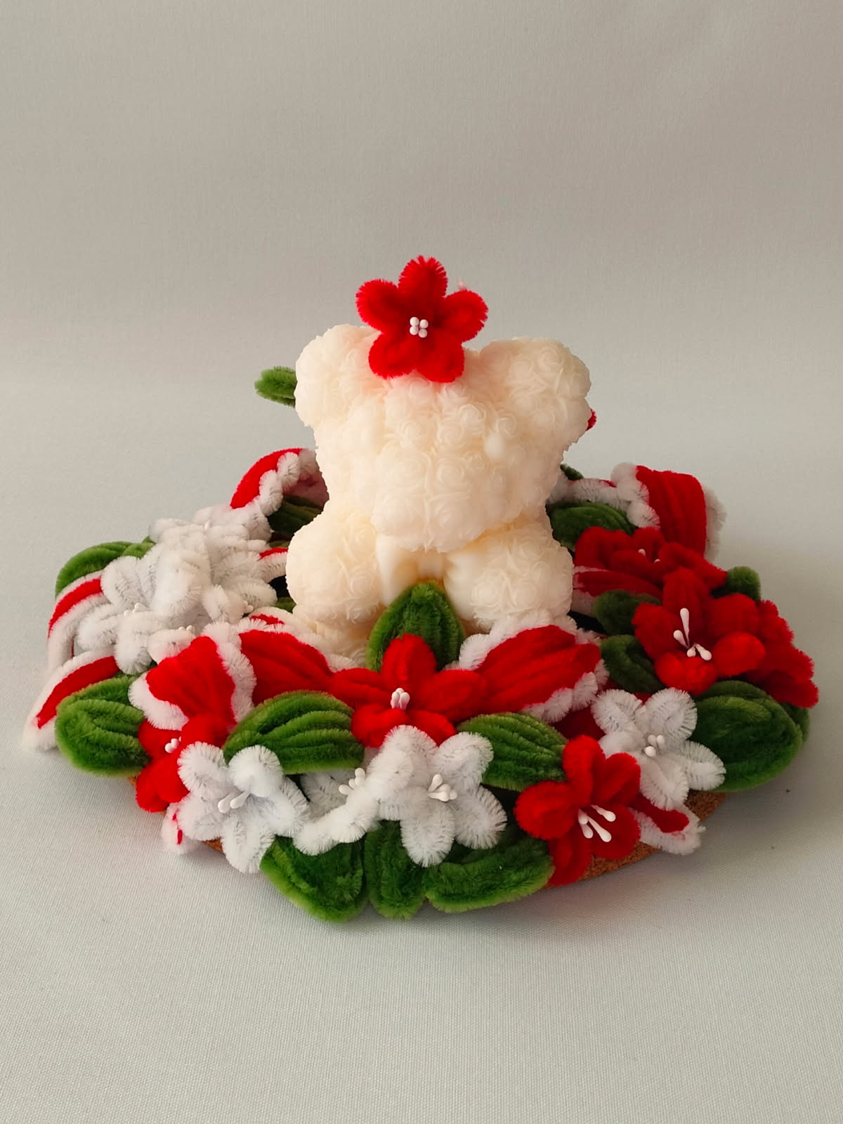 Håndlavet stor bamse lys arrangeret med julepynt.