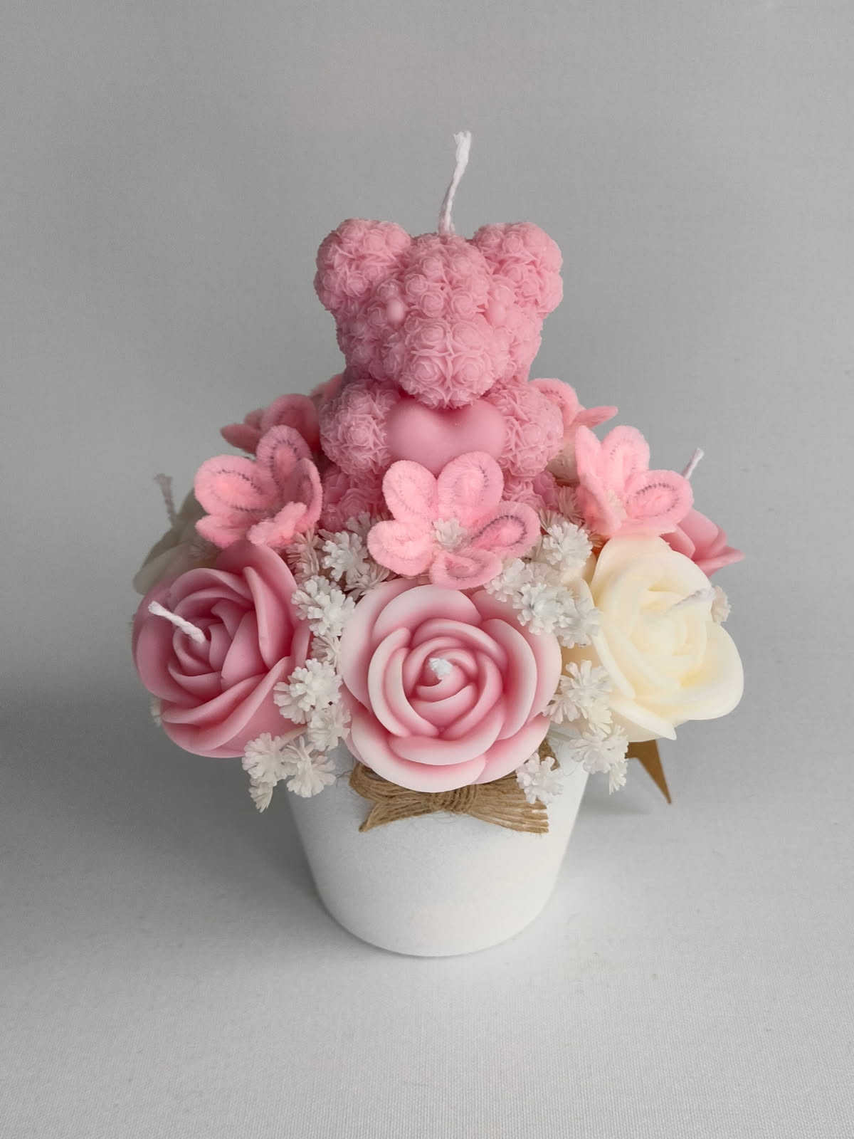 Lille kurv arrangeret med håndlavede sojalys blomster