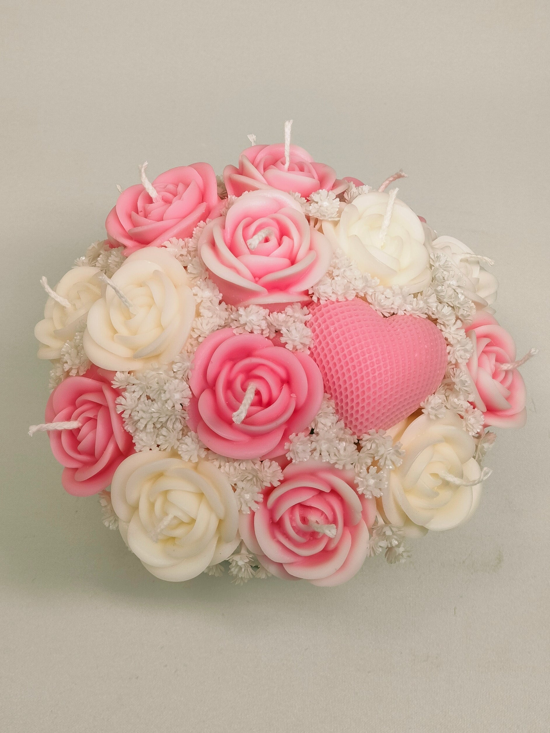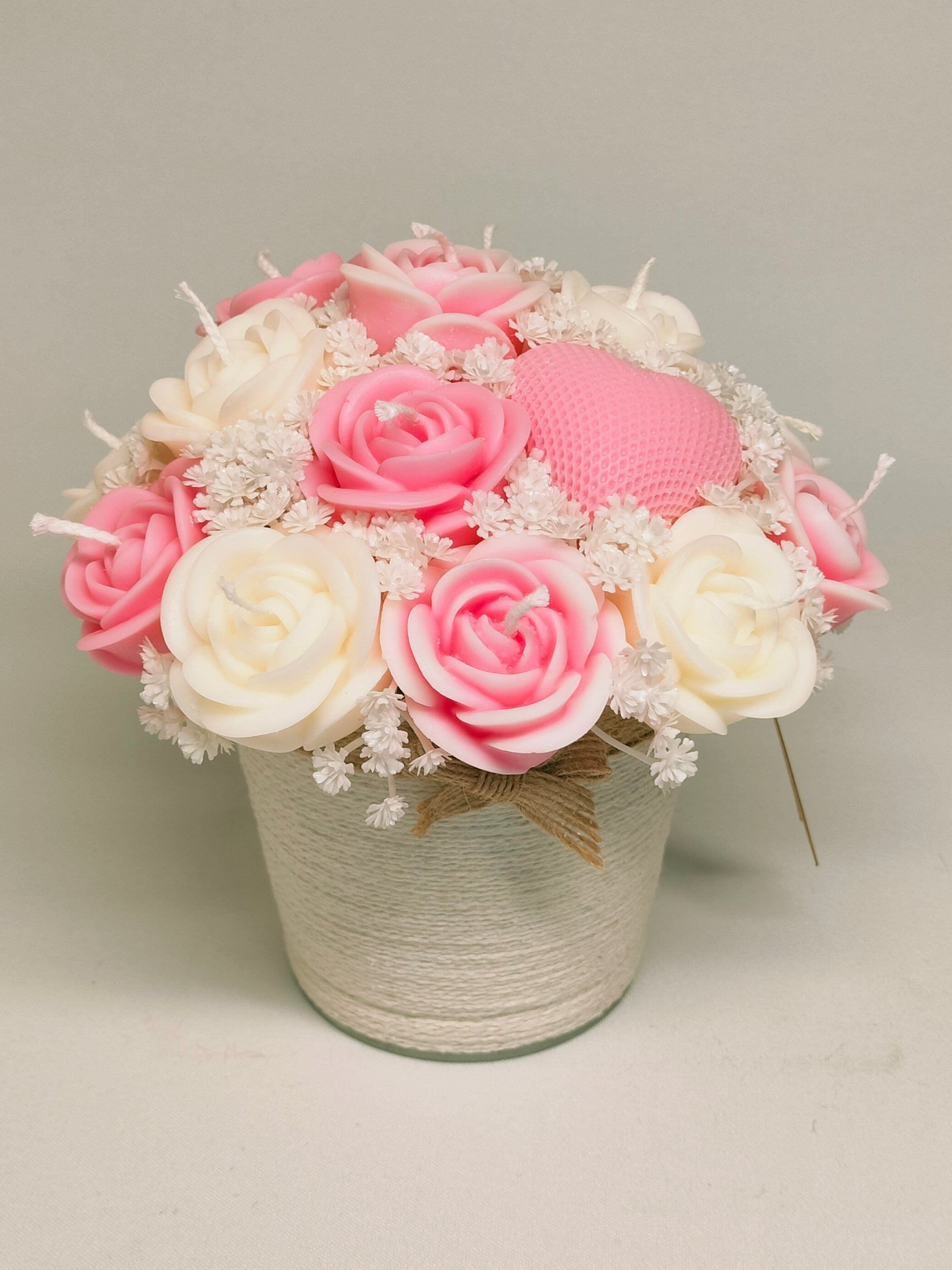 Kurv i naturlig farve omhyggeligt arrangeret med håndlavede sojalys blomster af 100% soja.