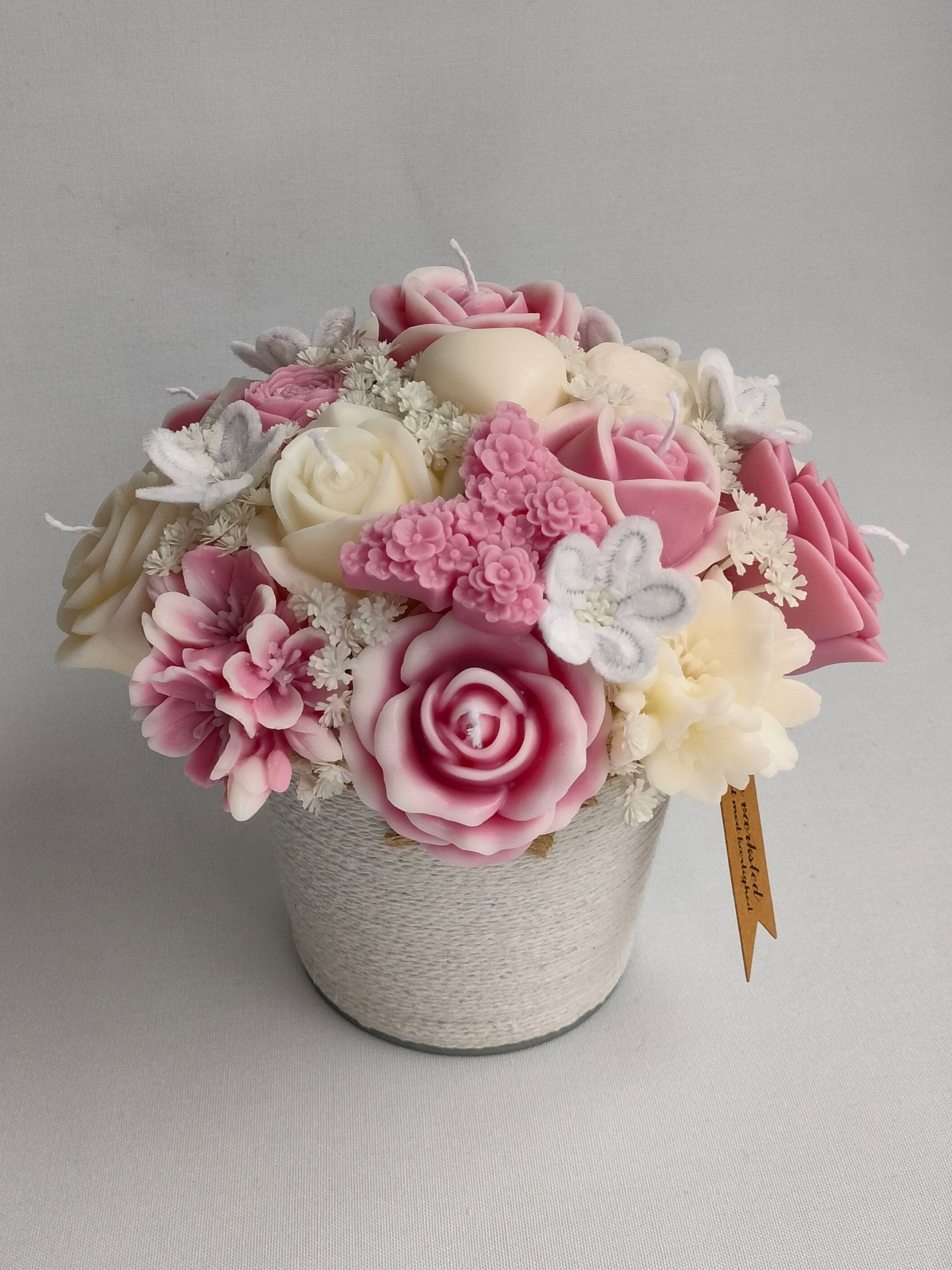 Kurv i naturlig farve omhyggeligt arrangeret med håndlavede sojalys blomster af 100% soja.