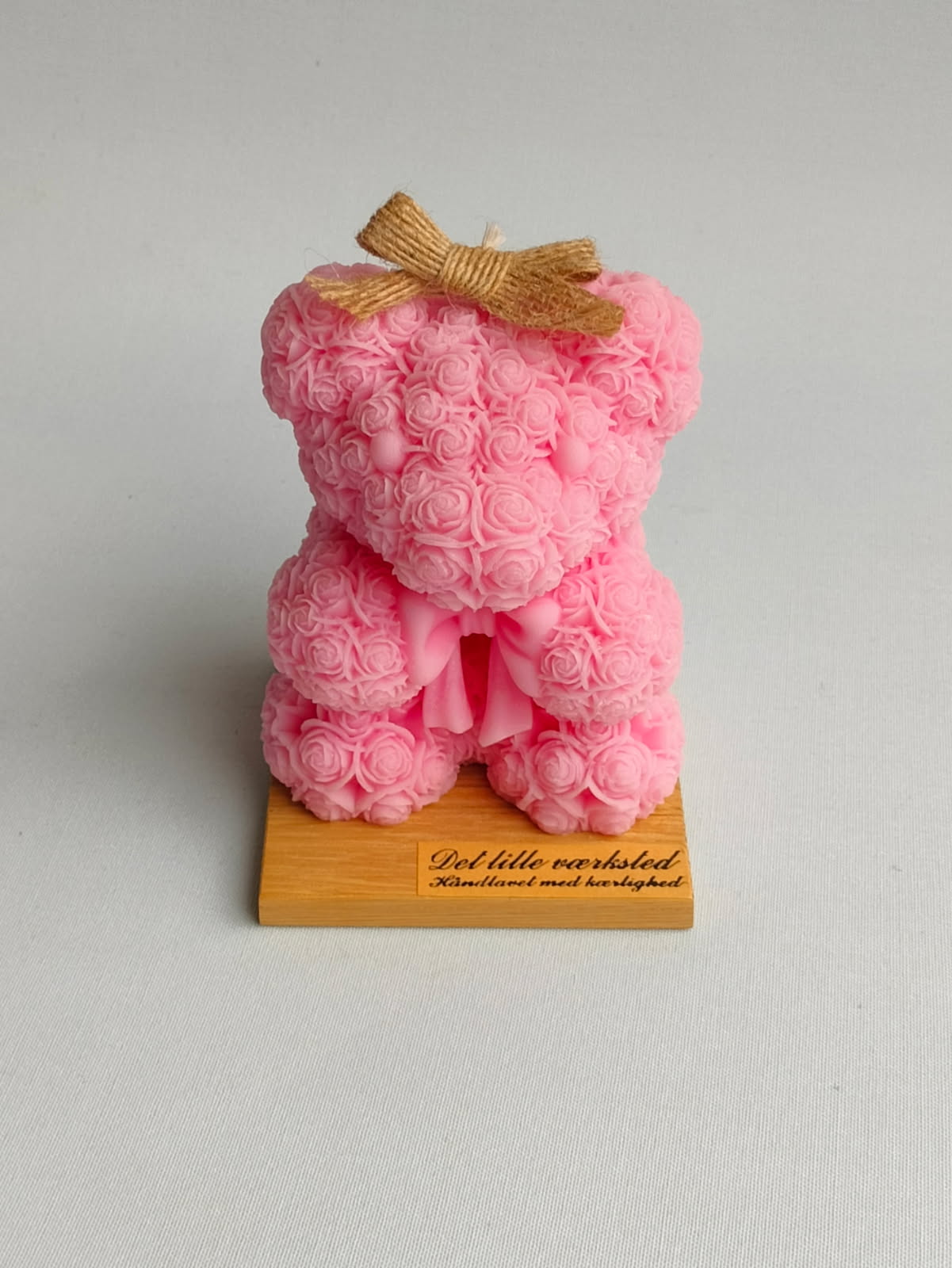 Stor bamse lys på et håndlavet træbakke.
