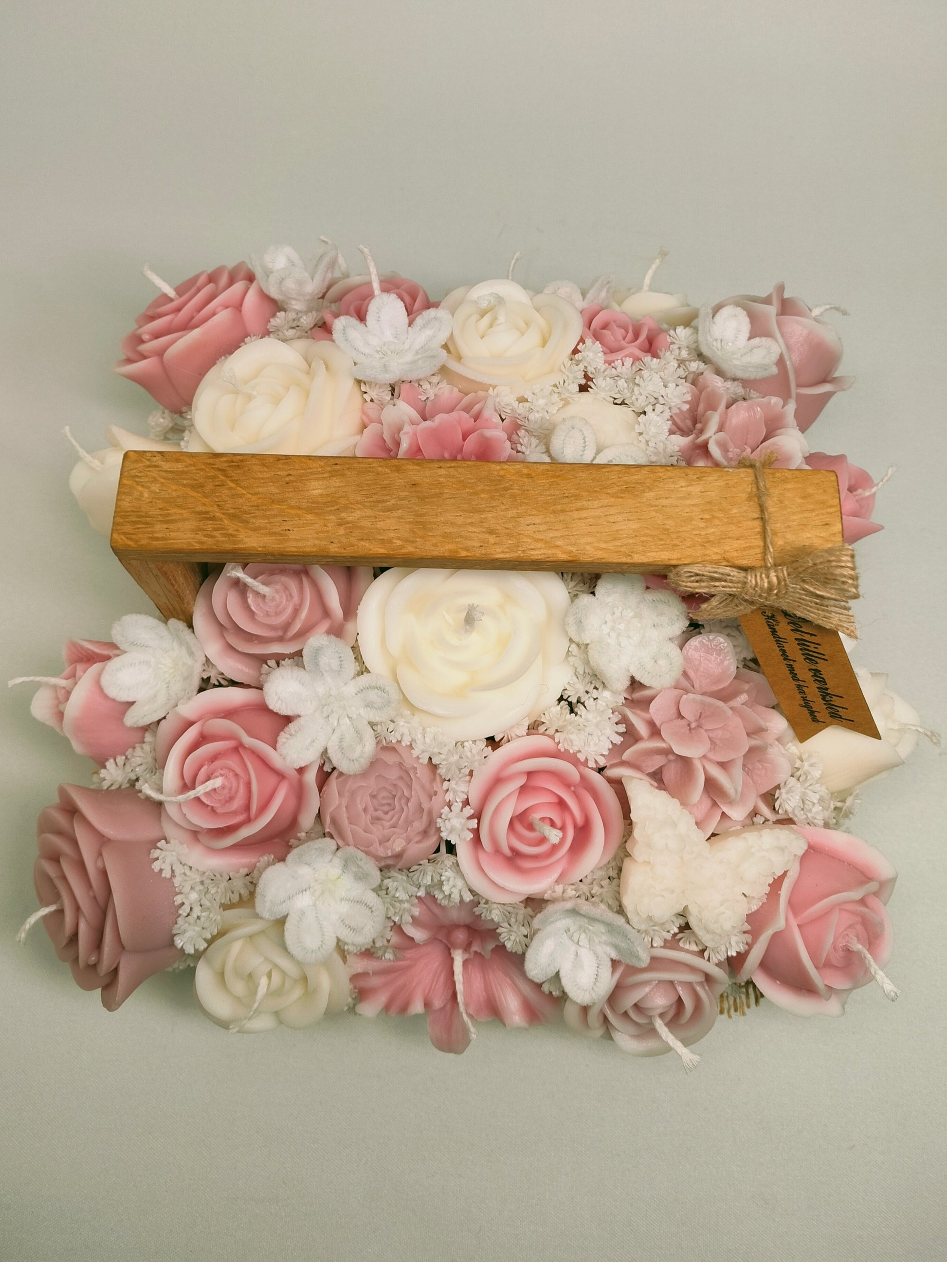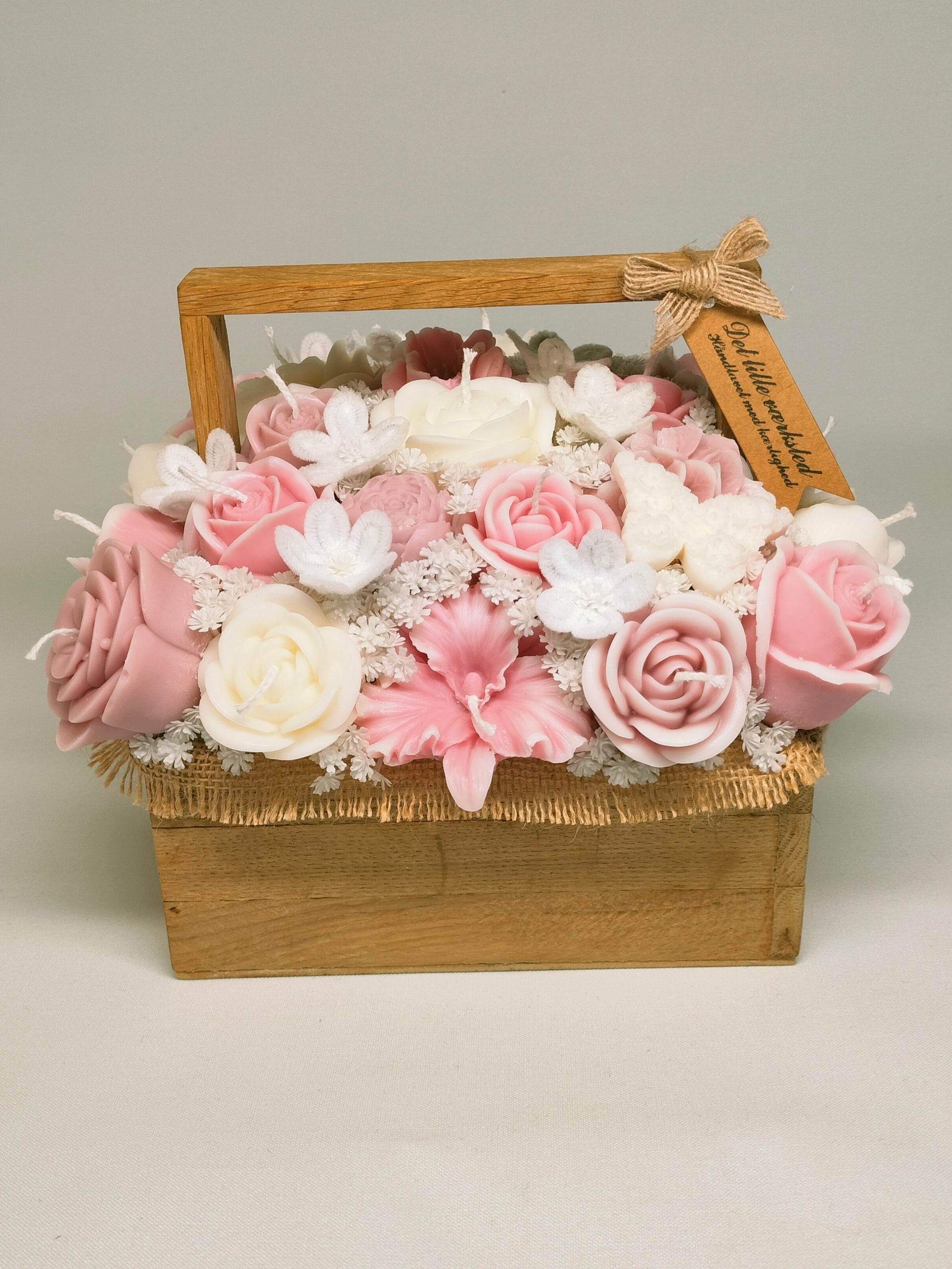 Trækurv i naturlig farve omhyggeligt arrangeret med håndlavede sojalys blomster af 100% soja.